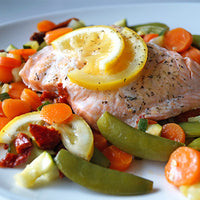 Gedämpfter Lachs mit Gemüse ist ein gesundes und einfaches Gericht, perfekt für eine schnelle Mahlzeit. Der Lachs und geschnittenes Gemüse wie Zucchini, Karotten und Zuckerschoten werden in einem Dampfgareinsatz über kochendem Wasser gedünstet. Mit Zitrone, Pfeffer, Salz und Dill gewürzt ist dieses leichte Gericht in 15 Minuten servierfertig.
