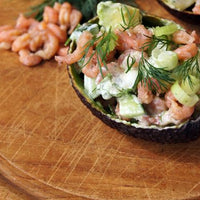 Gefüllte Avocado mit Garnelen ist ein einfaches und gesundes Gericht, ideal als Vorspeise, Mittagessen oder leichte Hauptmahlzeit. Das Avocadofleisch wird mit Gurke, Frühlingszwiebeln und holländischen Garnelen vermischt und mit einem Zitronen-Dill-Dressing gewürzt. Für eine attraktive Präsentation ohne Backen wird die Mischung wieder in die Avocadoschalen gegeben.