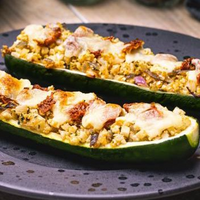 Gefüllte Zucchini sind eine gesunde und kohlenhydratarme Mahlzeit, ideal als vegetarisches Hauptgericht. Die Zucchinischiffchen sind mit einer Mischung aus gebratenen Zwiebeln, Knoblauch, Zucchinifleisch und Brokkoli- oder Blumenkohlreis gefüllt und mit italienischen Kräutern gewürzt. Die gefüllten Zucchini werden mit sonnengetrockneten Tomaten und geschmolzenem Mozzarella belegt und im Ofen goldbraun gebacken. Perfekt für eine leichte und leckere Mahlzeit.