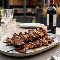 Voor wie minder vlees eet, is de vlezige structuur van oesterzwammen ideaal. Gemarineerd in olijfolie, knoflook, sojasaus en honing, en vervolgens knapperig gegrild aan een spies.