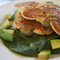 Diese Pfannkuchen aus Kichererbsenmehl sind eine herzhafte und gesunde Option, reich an Eiweiß und Ballaststoffen. Für den Pfannkuchenteig wird Kichererbsenmehl mit Wasser und Salz vermischt, während die Füllung aus knusprig frittiertem Hähnchenfilet, Spinat, Oliven, Avocado, Pinienkernen und Gewürzen wie Kreuzkümmel und Knoblauch besteht. Die Pfannkuchen werden in der Pfanne goldbraun gebraten und dann auf einem Bett aus frischem Spinat mit Avocado serviert. Eine nahrhafte Mahlzeit, die innerhalb von 30 Minuten fertig ist!