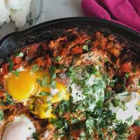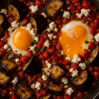 Shakshuka mit Auberginen und Feta ist ein leckeres Eintopfgericht, bei dem pochierte Eier in einer würzigen Tomatensauce mit Paprika, Auberginen und Kräutern köcheln. Die Soße wird mit Ras el Hanout gewürzt, während zerkrümelter Feta und frischer Koriander das Gericht abrunden. Dieser marokkanische Klassiker ist einfach zuzubereiten und eignet sich perfekt zum Servieren in einer Tajine für eine authentische Note.