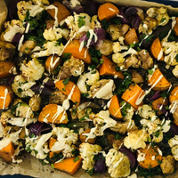 Süßkartoffel und Blumenkohl aus dem Ofen