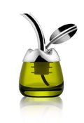 Die Designerin Marta Sansoni hat diese Ölflasche 2014 für den Italiener Alessi entworfen. Es ist tatsächlich mehr als eine Ölflasche, denn der glänzende Ausgießer aus Edelstahl kann einfach auf jede beliebige Ölfolienflasche gesteckt werden.