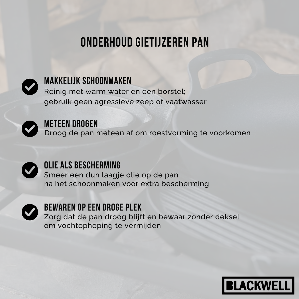 Da diese Blackwell Töpfe keine Antihaftbeschichtung haben, ist es wichtig, diese Blackwell Töpfe zu einbrennen. Handwäsche und sofortiges Abtrocknen werden empfohlen, um die Qualität des Gusseisens zu erhalten und Rostbildung zu vermeiden.
