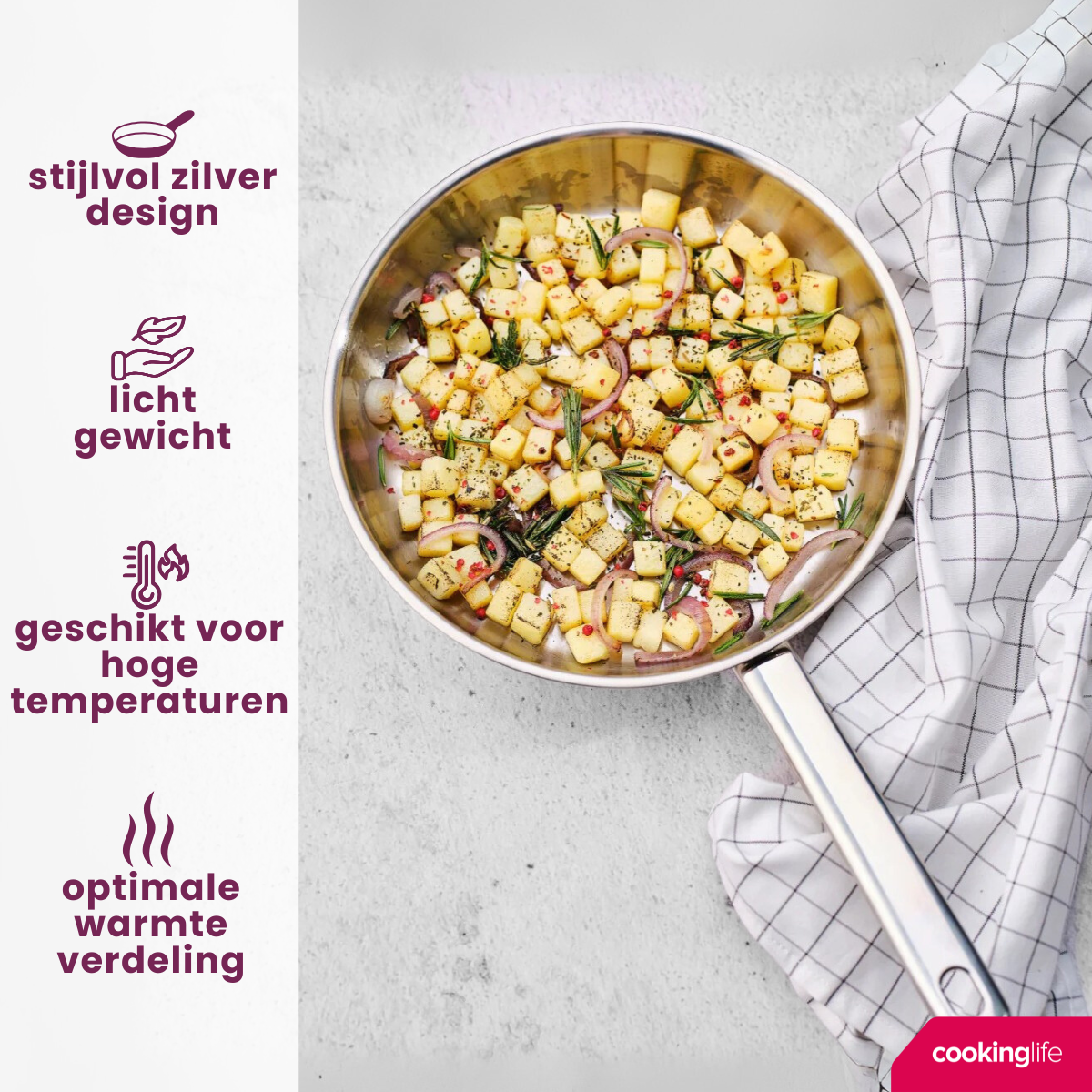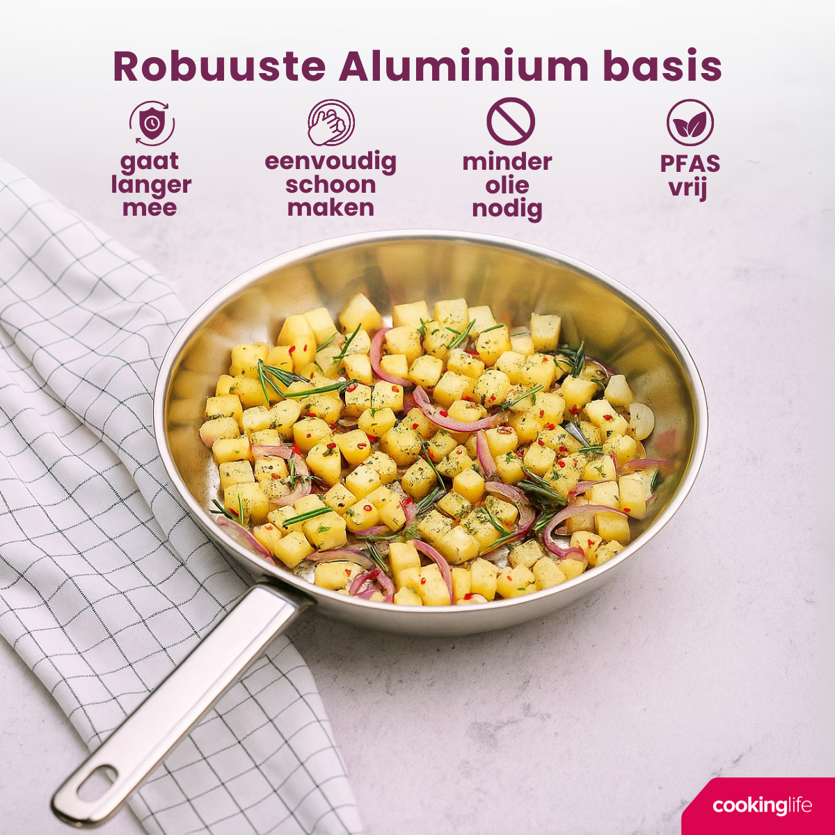 Entdecken Sie die Superior Bratpfanne von 24 cm von Cookinglife: eine Bratpfanne, die Ihre täglichen Kochkünste auf ein neues Niveau hebt. Dank der PFAS-freien Beschichtung können Sie mit weniger Fett braten, während die Pfanne robust genug ist für Gerichte, die etwas mehr Hitze benötigen – denken Sie an Steak, Fisch oder Gemüse. Die großzügige Größe ist perfekt für ein- oder zwei Personenportionen und bietet ausreichend Platz, um bequem zu braten, ohne dass die Zutaten über die Ränder spritzen.