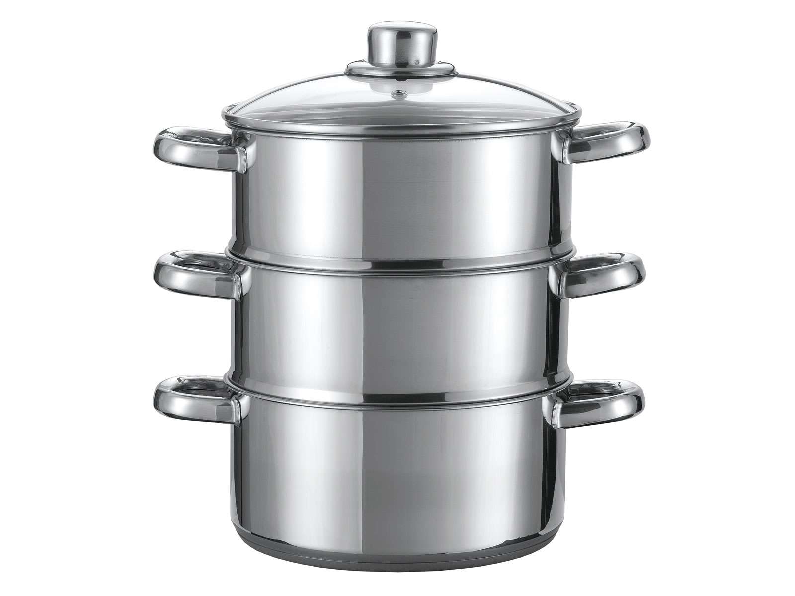 - Anzahl der Teile: 3 Teile (Pfanne, Dampfkorb/Einsatz, Deckel)