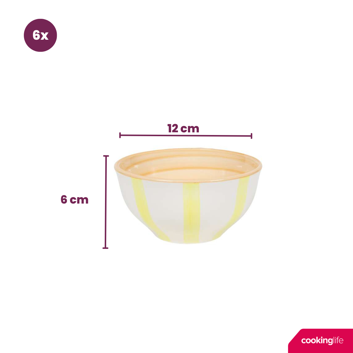 Dieses Set aus sechs kleinen Schalen der Spring Vibes-Kollektion von Cookinglife bringt eine frische, fröhliche Ausstrahlung auf deinen Tisch. Mit einem Durchmesser von 12 cm sind diese Schalen perfekt zum Servieren von Dips, Desserts, Snacks, Nüssen oder kleinen Beilagen. Das verspielte Design und die hellen Farben passen zu verschiedenen Geschirr-Stilen und verleihen jedem Dinner oder Snackmoment eine besondere Atmosphäre. Langlebig und praktisch, ideal für den täglichen Gebrauch.