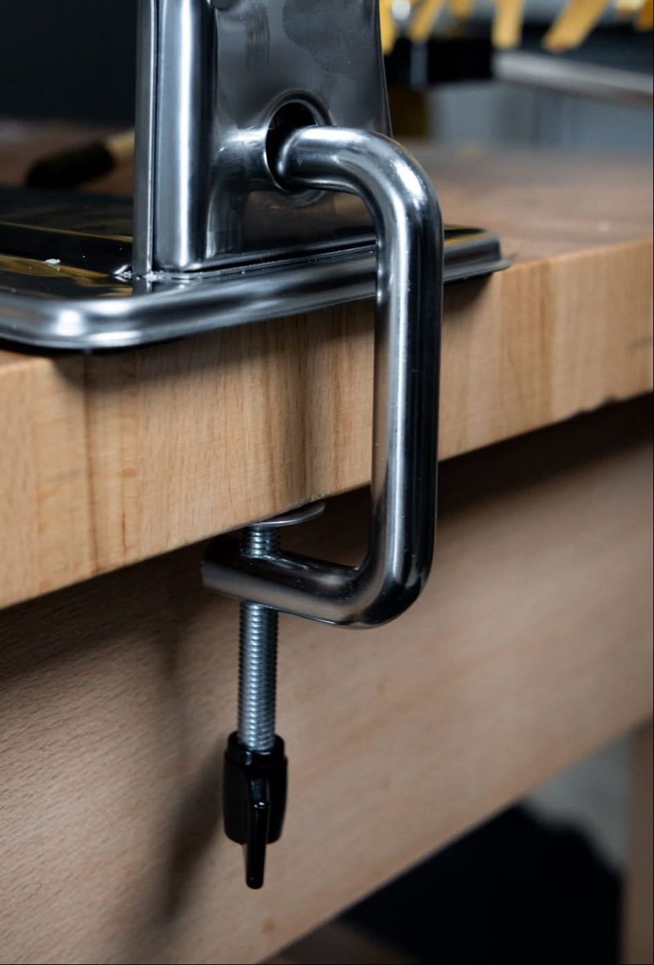 Verwenden Sie stets die Tischklemme, um die Nudelmaschine sicher zu befestigen und einen sicheren Stand während des Gebrauchs zu gewährleisten.