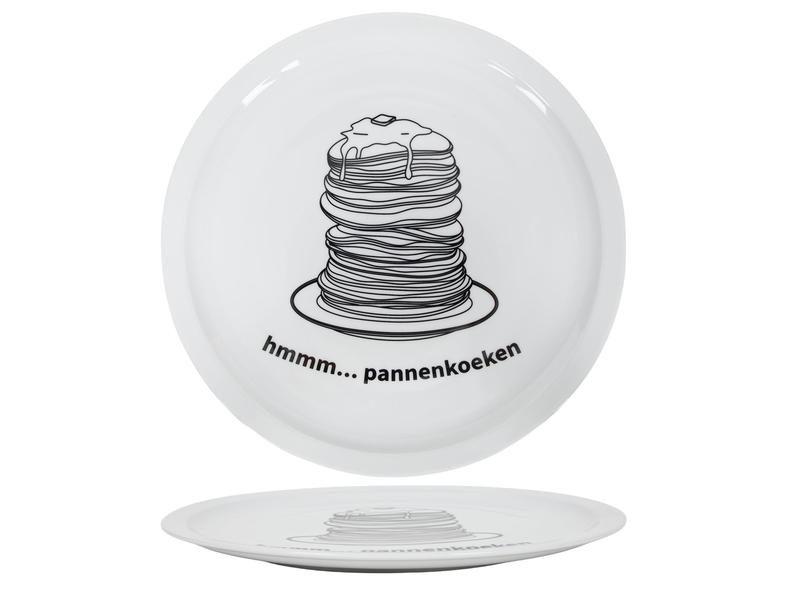 Dieses Set aus sechs Pfannkuchentellern wurde speziell für das ultimative Pfannkuchenmoment entworfen. Jeder Teller hat eine großzügige Größe von 30 cm, sodass Sie Stapel von Pfannkuchen schön präsentieren können. Auf jedem Teller befindet sich eine schwarze Illustration eines Stapels Pfannkuchen und der Text „hmmm... Pfannkuchen“ für einen verspielten und wiedererkennbaren Akzent. Das Porzellan fühlt sich angenehm an und verleiht eine fröhliche, einladende Ausstrahlung.