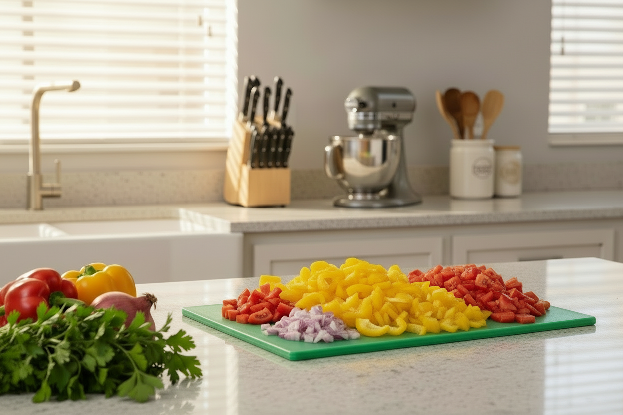 In der heimischen Küche ist die Farbkennzeichnung weniger streng, und Sie können das grüne Schneidebrett bedenkenlos für eine Vielzahl von Lebensmitteln verwenden, solange Sie es gründlich reinigen. Der robuste Kunststoff ist schnittfest, langlebig und lässt sich einfach in der Spülmaschine im Kurzprogramm reinigen. Das Brett steht sicher auf Ihrer Arbeitsfläche und ermöglicht Ihnen sicheres und kontrolliertes Arbeiten, egal ob Sie Zwiebeln schneiden oder Obst zubereiten.