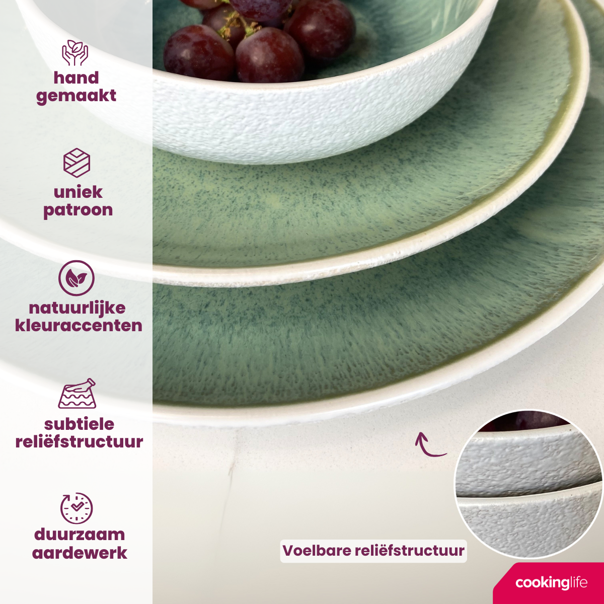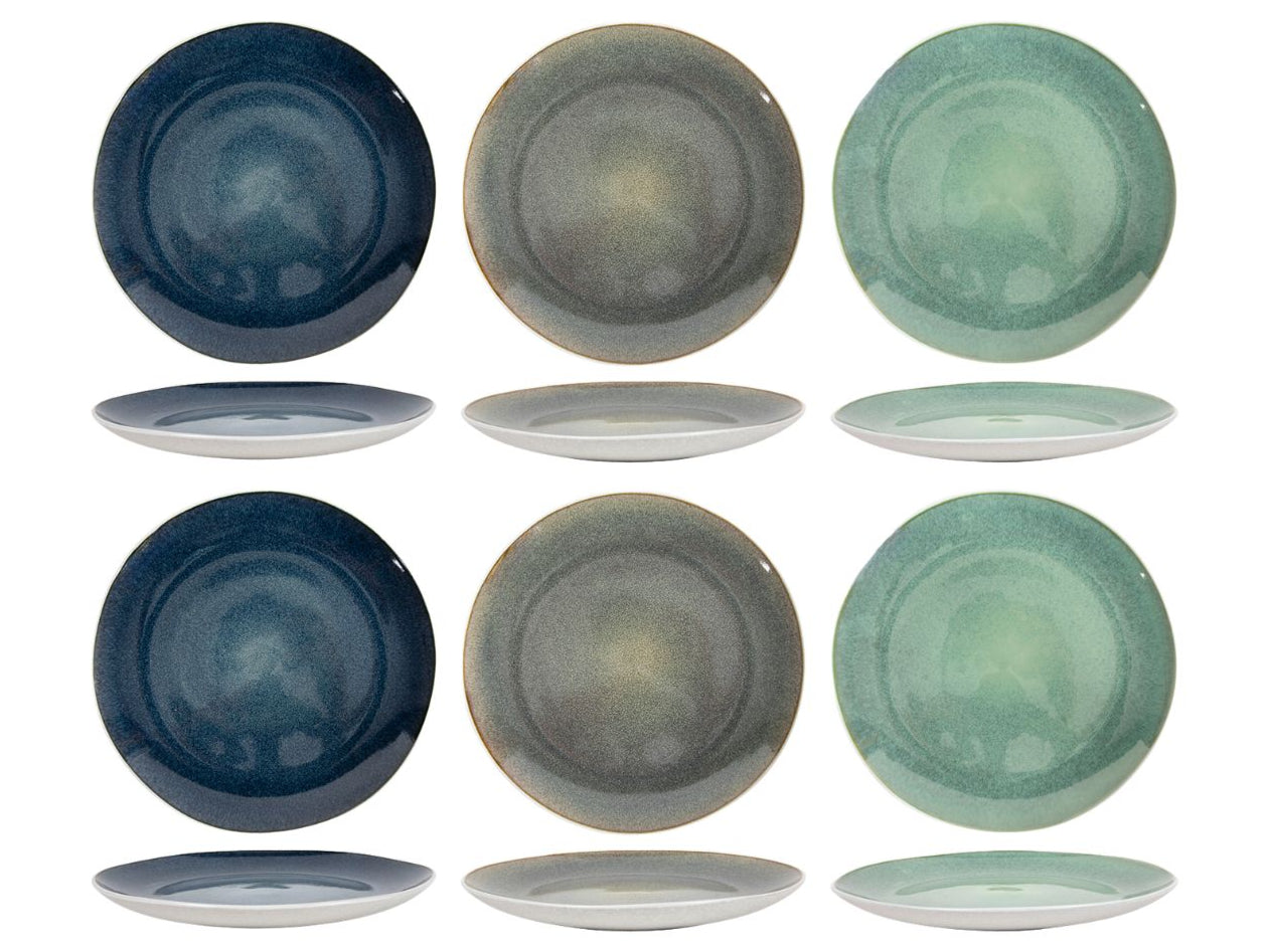 Die reaktive Glasurschicht kann Farbunterschiede verursachen: Jedes Geschirrteil ist daher ein Unikat. Der Boden der Cookinglife Belize Speiseteller-Kollektion ist weiß und weist eine dezente Reliefstruktur auf.