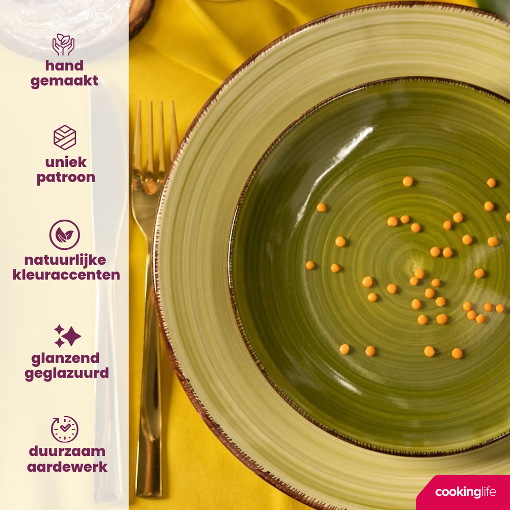 Die Cookinglife Speiseteller Delice Grün haben eine elegante Ausstrahlung und eine praktische Größe von 26,5 cm, perfekt zum Servieren von Hauptgerichten. Der sanfte Grünton verleiht deinem Tisch eine frische und beruhigende Atmosphäre, wodurch diese Teller nicht nur funktional sind, sondern auch eine visuelle Bereicherung für deine Geschirrkollektion darstellen. Hergestellt aus robustem Keramik, sind diese Teller für den täglichen Gebrauch geeignet, aber auch ideal für einen schön gedeckten Tisch bei besonderen Anlässen.