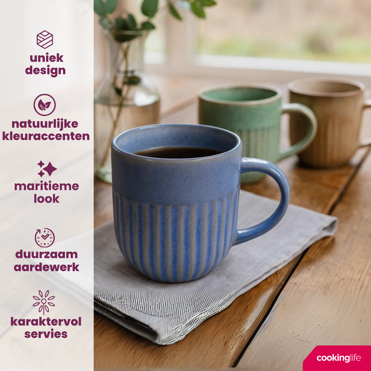 Bringen Sie eine frische, maritime Atmosphäre in Ihren Moment mit diesem Set von 6 Aqua Maris-Tassen von Cookinglife. Die sanfte Aquafarbe bietet eine ruhige Ausstrahlung, die perfekt zu jeder Tasse Kaffee, Tee oder heißem Getränk passt. Hergestellt aus langlebigem Steinzeug, kombinieren diese Tassen Stil mit Benutzerfreundlichkeit – ideal für den täglichen Genuss mit Freunden oder Familie.