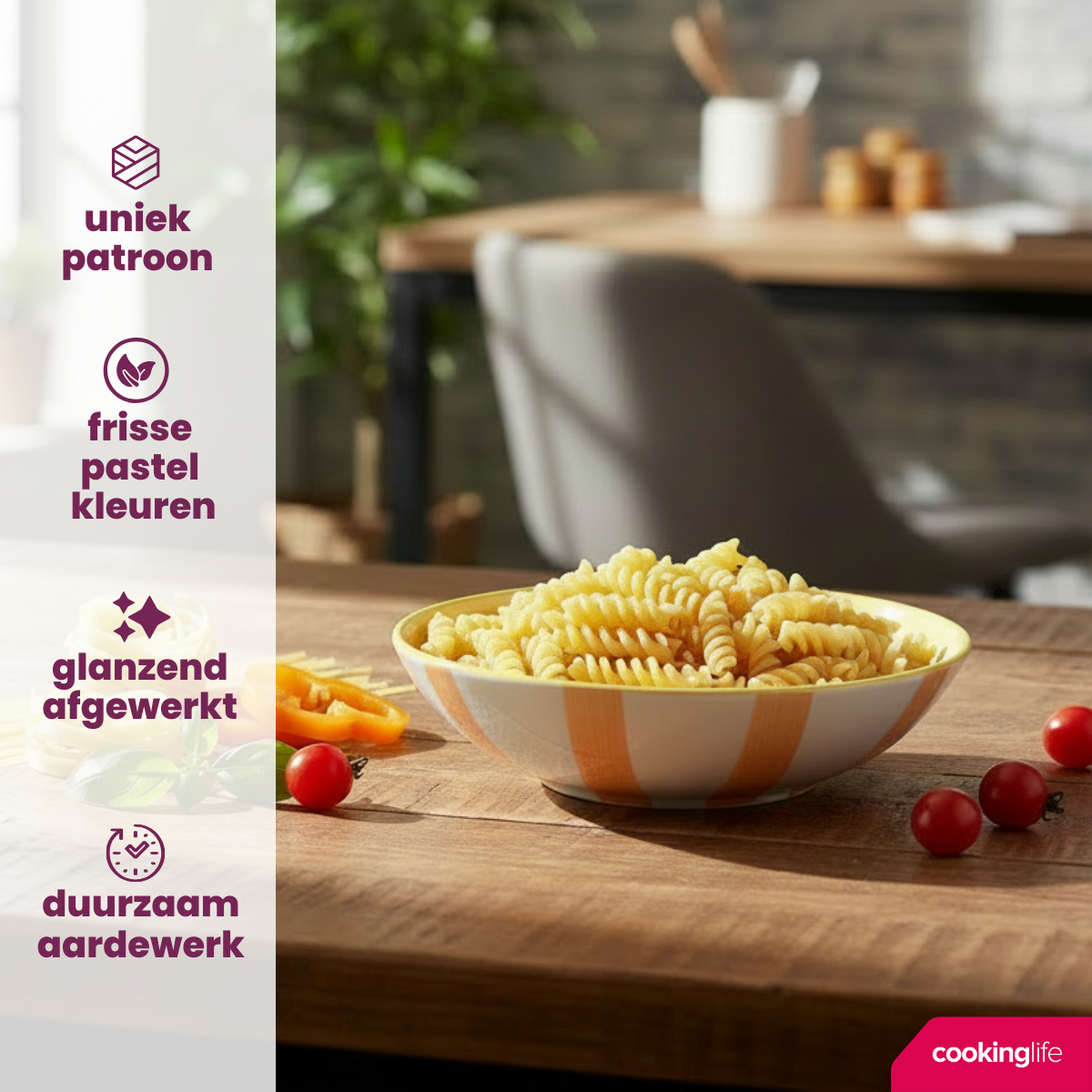Die Cookinglife Tiefe Teller Spring Vibes haben einen Durchmesser von 21 cm und sind ideal zum Servieren von Suppen, Pasta oder Salaten. Die Cookinglife Spring Vibes Kollektion ist mit ihren frischen Pastellfarben der subtile Gegenpart zu den fröhlichen, präsenten Farben der Cookinglife Summer Vibes Kollektion. Dieses Set von 6 Stück zeichnet sich durch ein fröhliches gestreiftes Design in frischen Pastellfarben aus, was für eine lebendige und moderne Ausstrahlung auf deinem Tisch sorgt. Dank des vielseitigen Designs passen diese tiefen Teller perfekt in jede Küche und können für verschiedene Zwecke verwendet werden.