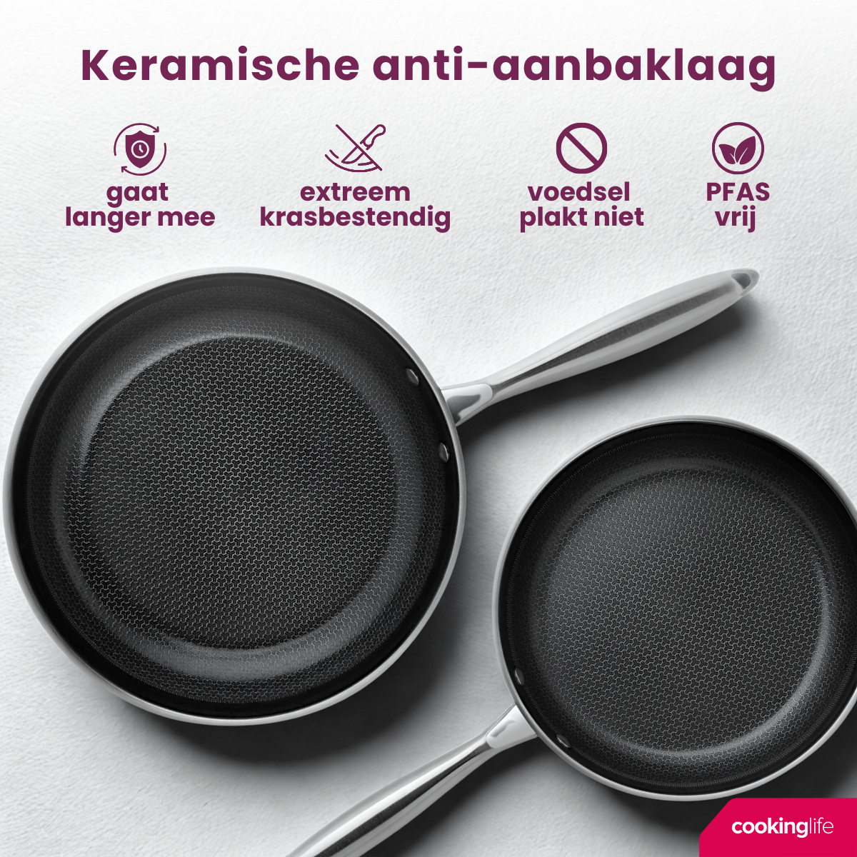 Verbessern Sie Ihr Wok-Erlebnis mit der Cookinglife HexaCook Wok-Pfanne von 28 cm. Die keramische anti-aanbaklaag ist PFAS-frei und macht das Kochen gesünder und einfacher. Geeignet für alle Wärmequellen, einschließlich Induktion, sodass Sie überall problemlos braten, sautieren oder wokken können. Mit robustem Tri-Ply Edelstahl und einer Hitzebeständigkeit von bis zu 220 °C ist diese Pfanne sowohl funktional als auch langlebig. Die HexaCook-Kollektion von Cookinglife ist spülmaschinenfest, wir empfehlen jedoch, diese Pfannen von Hand zu reinigen.