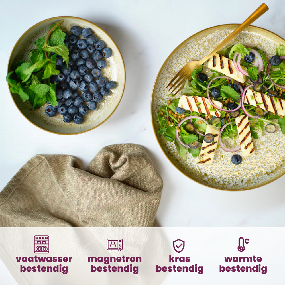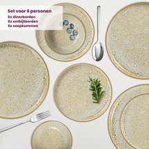 Suchst du nach einem einzigartigen und stilvollen Geschirrset? Dann ist das Cosy & Trendy Serviesset Baltic Luna 18-teilig genau das, was du suchst! Das Geschirr hat eine schöne olivgrüne/gelbe Farbe und ist aus robustem Steinzeug gefertigt. Außerdem hat jeder Teller und jede Schüssel ein einzigartiges Muster. Dieses 16-teilige Set besteht aus:
