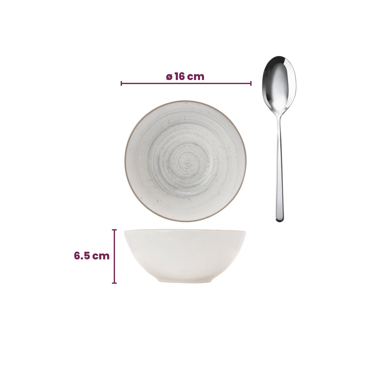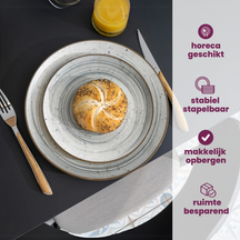 Das Cosy & Trendy Geschirrset Sintra Dusty Blue ist ein komplettes 16-teiliges Set für 4 Personen. Das Set besteht aus vier Speisetellern, Frühstückstellern, tiefen Tellern und Schalen, die jeweils mit einem subtilen Spiraldesign versehen und in einem ruhigen blau-grauen Farbton gestaltet sind. Dank des reaktiven Glases ist jedes Geschirrteil einzigartig in Farbnuance und Ausstrahlung.