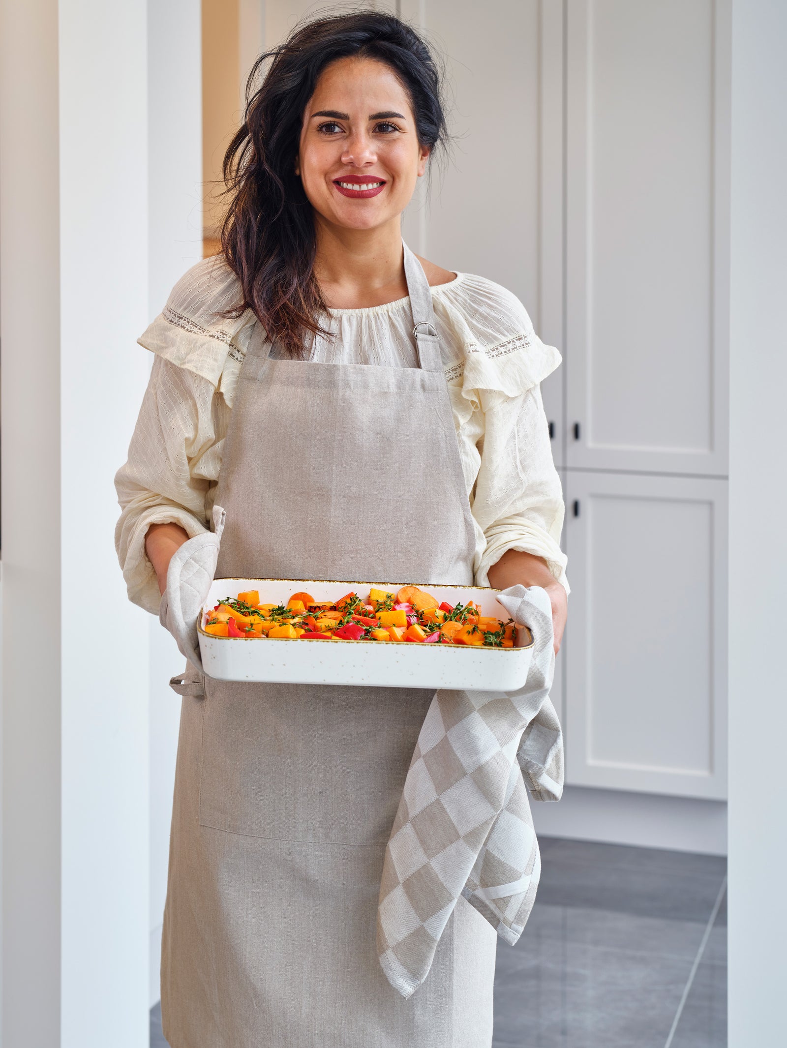 Arbeiten Sie bequem und stilvoll in der Küche mit dieser Küchenschürze von Cosy & Trendy in sanfter Sandfarbe. Hergestellt aus robustem, dicht gewebtem Baumwollstoff schützt sie Ihre Kleidung vor Spritzern und Flecken. Dank des verstellbaren Nackenbands und des Taillenbands lässt sich die Schürze einfach an Ihre Größe anpassen. Die Vordertaschen bieten praktischen Stauraum für Küchenutensilien oder ein Geschirrtuch. Mit diesem zeitlosen Design verleihen Sie Ihrem Kochbereich sofort ein frisches, natürliches Aussehen.