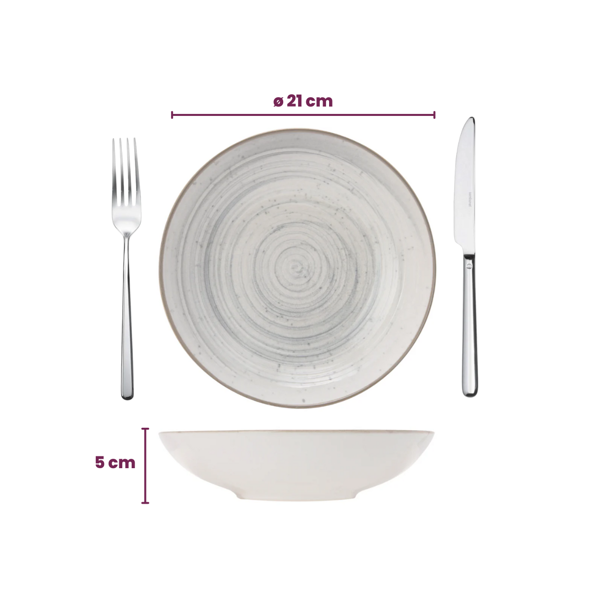 Diese tiefen Teller aus der Sintra-Kollektion von Cosy & Trendy haben einen Durchmesser von 21 cm und sind ideal zum Servieren von Pasta-Gerichten, Suppen, Salaten oder anderen Gerichten mit einer reichhaltigen Sauce. Die subtile blaue Glasur, kombiniert mit einem spiralförmigen Muster und einem dunklen Rand, verleiht dem Teller eine stilvolle und beruhigende Ausstrahlung auf dem Tisch. Durch die reaktive Glasur ist jeder Teller einzigartig.