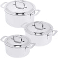 Was diese Töpfe wirklich auszeichnet, ist das solide 5-Schicht-Material, das bis zum Rand reicht. Dies sorgt für eine gleichmäßige Wärmeverteilung und eine optimale Temperaturkontrolle. Ob Sie auf Gas kochen, wo die Wände der Töpfe sogar die Restwärme der Flamme nutzen, oder auf einem anderen Herd wie Induktion oder im Backofen; Dieses Set passt perfekt in jede Situation.