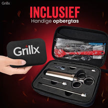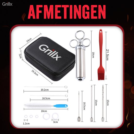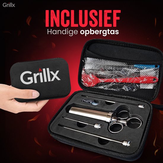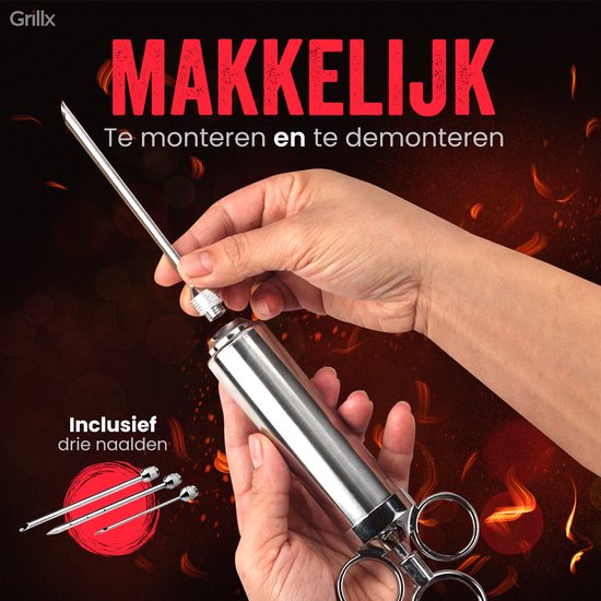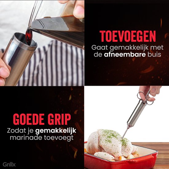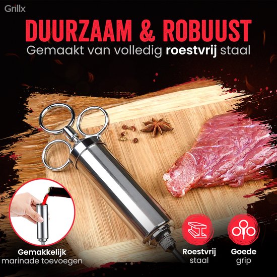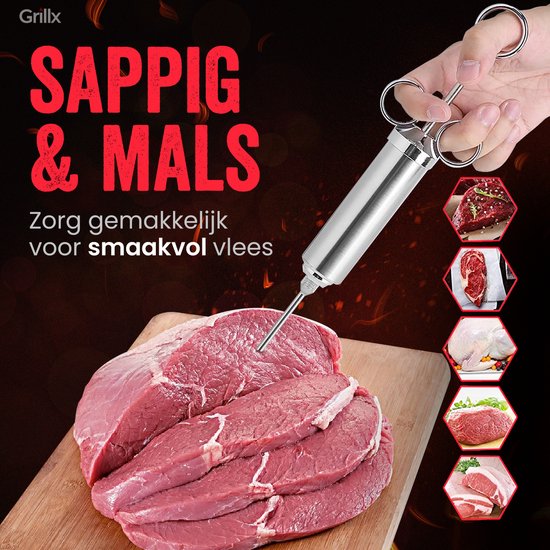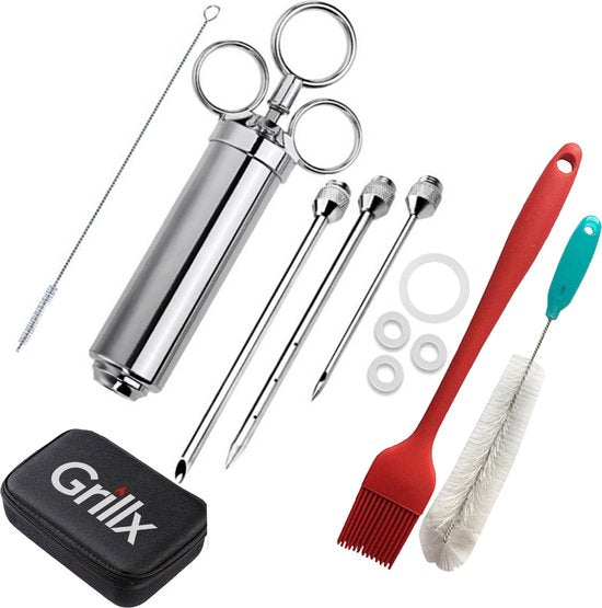 Mit der GrillX Luxe Marinade Injektionsspritze gibst du deinem Fleisch ein geschmackvolles Upgrade. Diese praktische Injektionsspritze ist speziell dafür entworfen, köstliche Flüssigkeiten in dein Fleisch zu injizieren, wie Marinaden, Butter und Pökellake. Mit den drei verschiedenen Nadeln kannst du jedes Fleisch saftig halten während des Bratens oder Grillens.