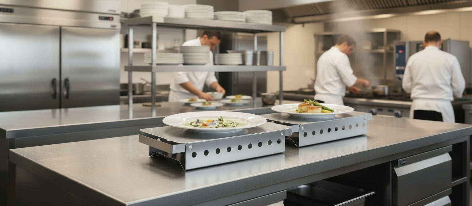 Der Hendi Tellerwärmer mit 2 Teelichthaltern ist eine robuste und zuverlässige Lösung, um Ihre Teller am Buffet oder Tisch warmzuhalten. Die aus satiniertem Aluminium gefertigte Warmhalteplatte sitzt sicher in einem Edelstahlrahmen und sorgt so für gleichmäßige Wärmeverteilung und ein professionelles Erscheinungsbild. Zusätzlich verfügt der Tellerwärmer über zwei integrierte Teelichthalter (Ø 51 x (H) 17 mm), in denen Sie Teelichter zur Wärmeerzeugung verwenden können. Ideal für Umgebungen ohne Stromanschluss.
