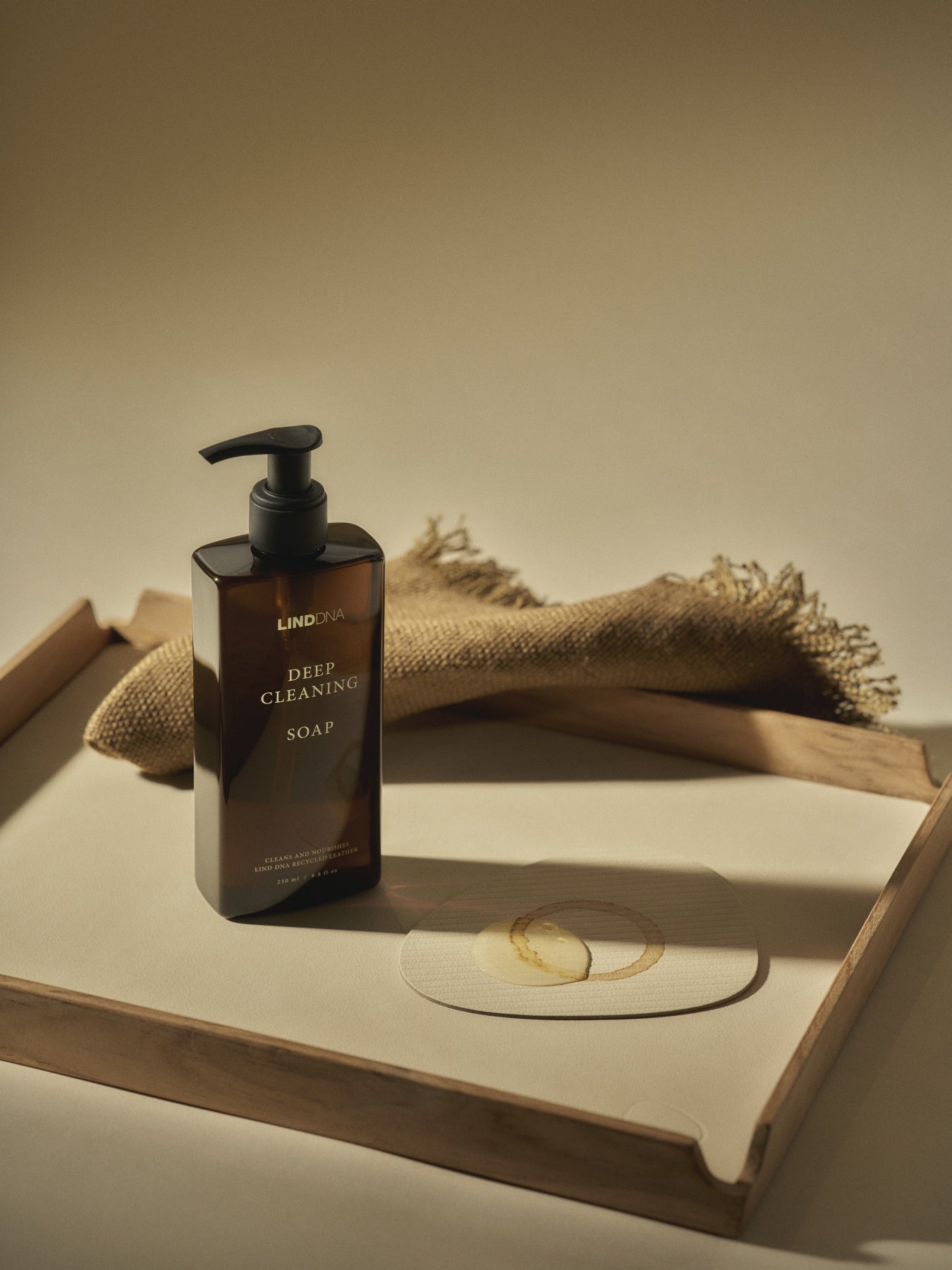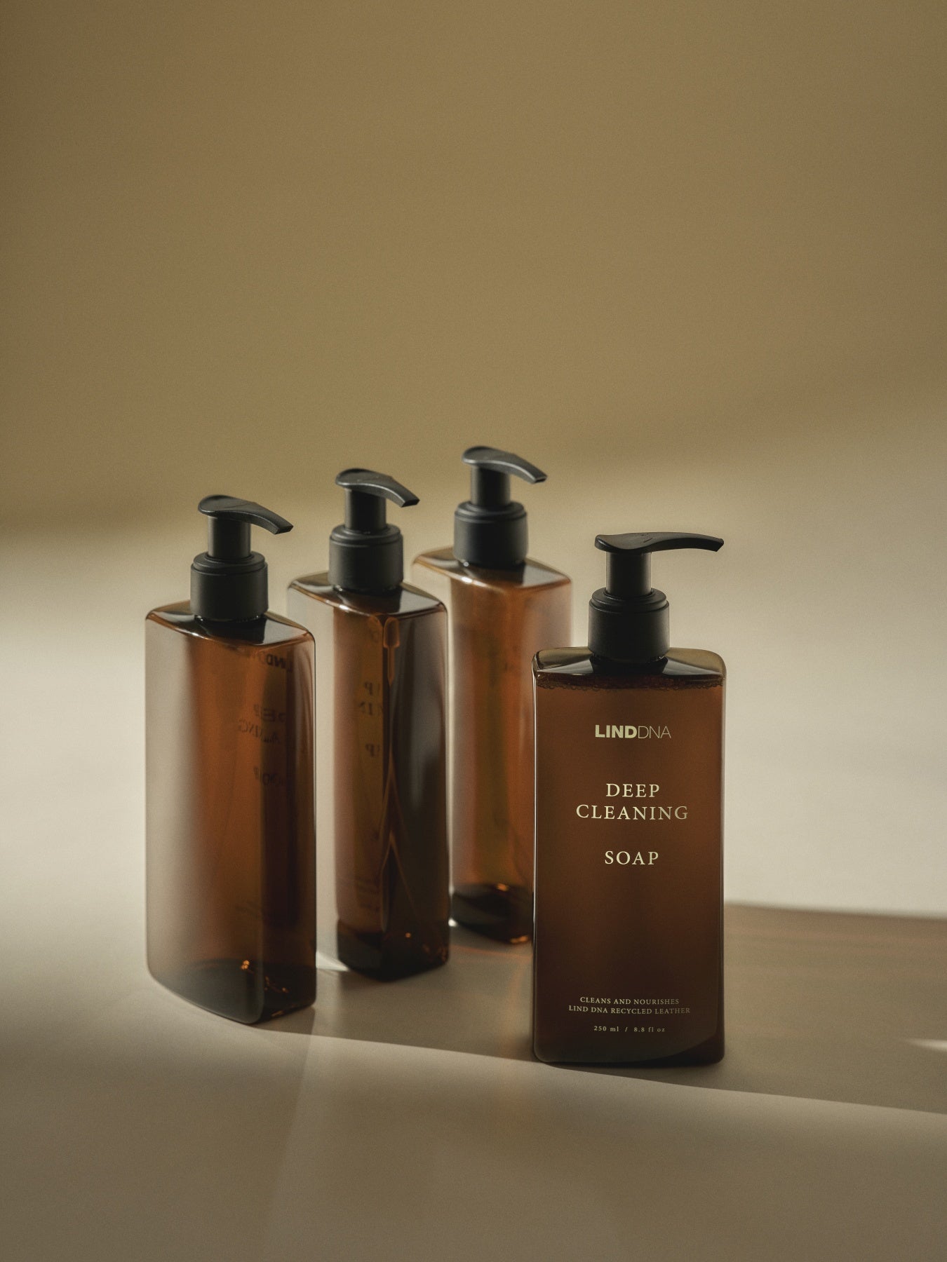 Halten Sie Ihre LIND DNA Platzsets und Untersetzer mit dem LIND DNA Deep Cleaning Soap. Diese Flüssigseife wurde speziell für die gründliche und schonende Reinigung von Produkten aus recyceltem Leder entwickelt.