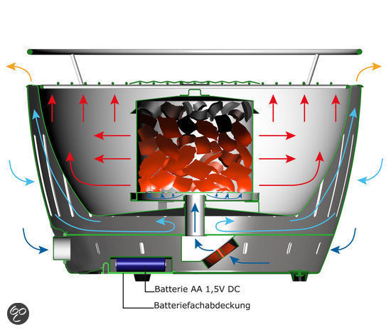 Eine optimale Luftzirkulation wird durch einen Ventilator erreicht, der mit 4 AA-Batterien oder einem USB-Kabel betrieben wird, wenn die Batterien erschöpft sind. Dieser kompakte Grill ist ideal für Gesellschaften von bis zu 5 Personen und wird standardmäßig in einer robusten Tragetasche aus Nylon geliefert, die leicht überallhin mitgenommen werden kann!