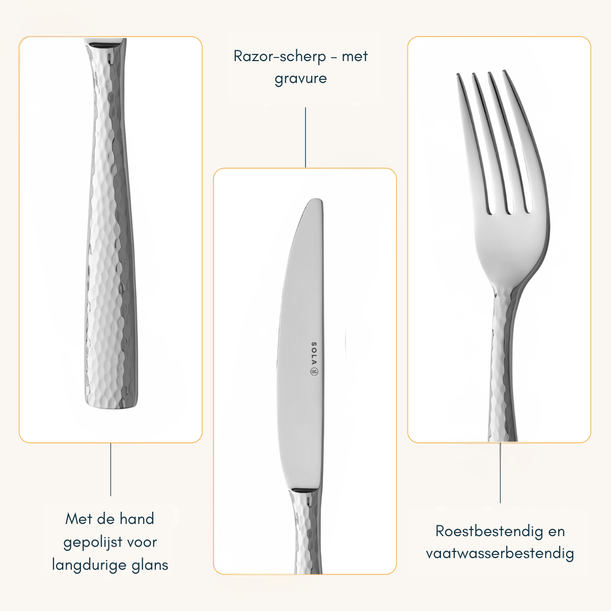 Diese Kollektion ist für den täglichen Gebrauch konzipiert, eignet sich aber auch ideal für besondere Anlässe dank des stilvollen und zeitlosen Designs. Das Besteck liegt angenehm in der Hand und ist perfekt ausbalanciert, was zu einem komfortablen Esserlebnis beiträgt. Darüber hinaus ist das Besteck spülmaschinenfest, was es sowohl praktisch als auch elegant macht.