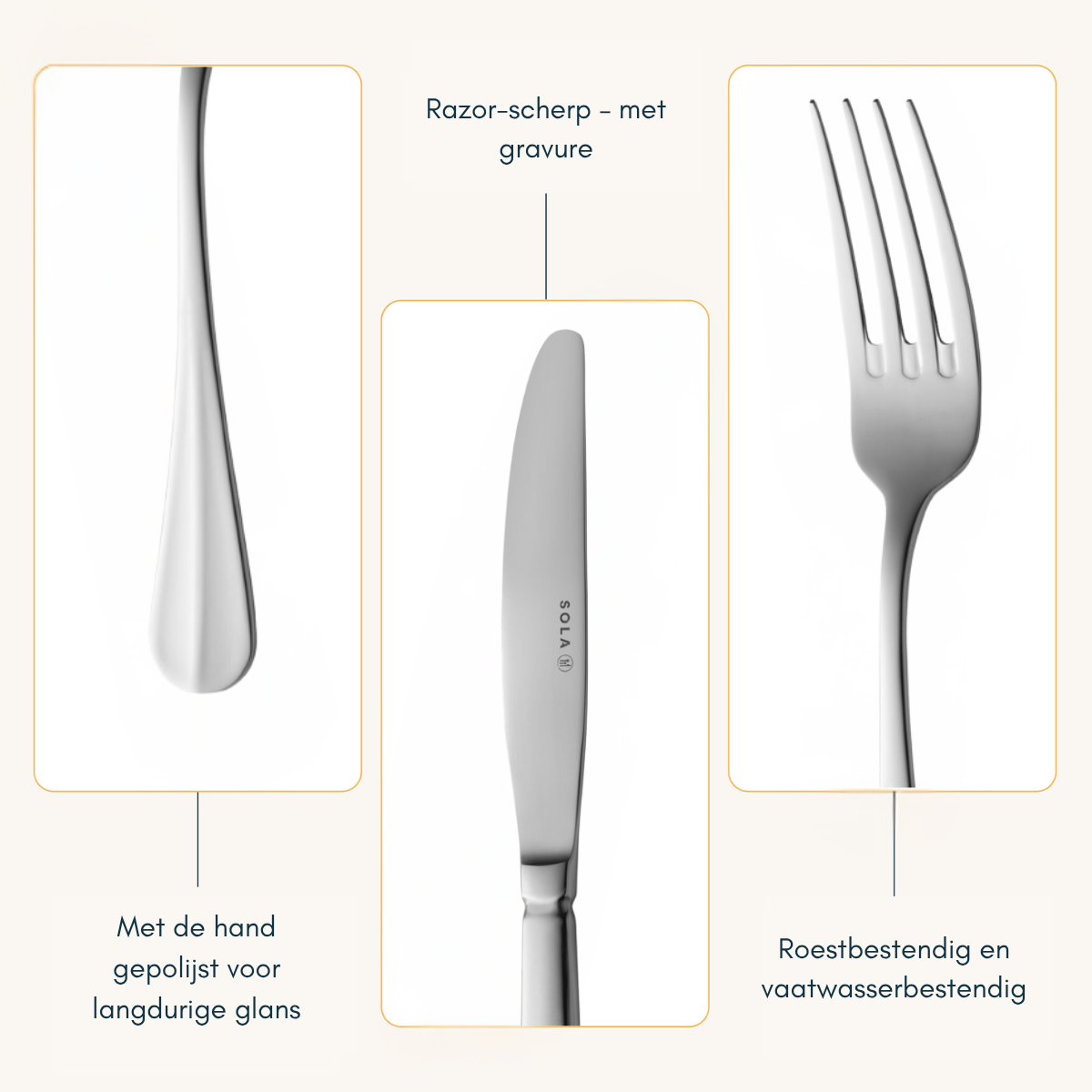 Sind Sie bereit für neues Besteck und legen Wert auf Qualität? Dieses Sola-Besteckset Hollands Glad ist ein 24-teiliges Set, bestehend aus den am häufigsten verwendeten Besteckteilen in der Küche. Das Sola-Besteck besteht aus silberweißem 18/10-Edelstahl. Silberweißer Edelstahl 18/10 ist eine Stahllegierung aus 18 Teilen Chromstahl und 10 Teilen Nickel. Diese Zusammensetzung macht das Besteck rostfrei und spülmaschinenfest. Dieses Set besteht aus: