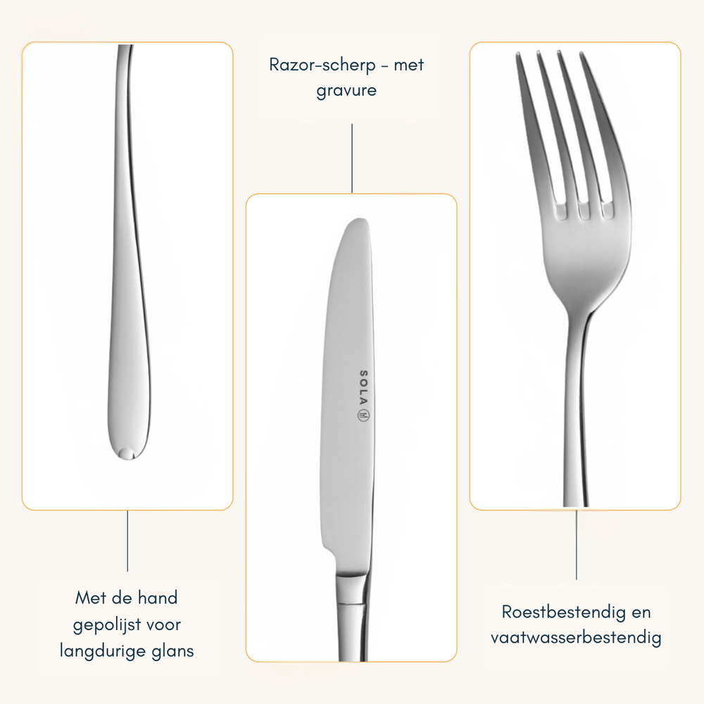 Ob Sie ein gemütliches Frühstück mit der Familie oder ein formelles Abendessen mit Freunden veranstalten, das Sola Fleurie Besteckset ist perfekt für jeden Anlass. Seine Kombination aus Funktionalität und Eleganz macht dieses Set zu einer unverzichtbaren Ergänzung für Ihre Küche.