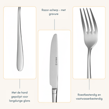 Dieses Besteckset aus hochwertigem 18/10 Edelstahl bietet hervorragende Haltbarkeit und Rostbeständigkeit. Sie können jedes Teil bedenkenlos in der Spülmaschine reinigen, was eine einfache Pflege und lange Lebensdauer gewährleistet. Dadurch ist das Set perfekt für den täglichen Gebrauch geeignet, ohne Kompromisse bei der Qualität einzugehen.