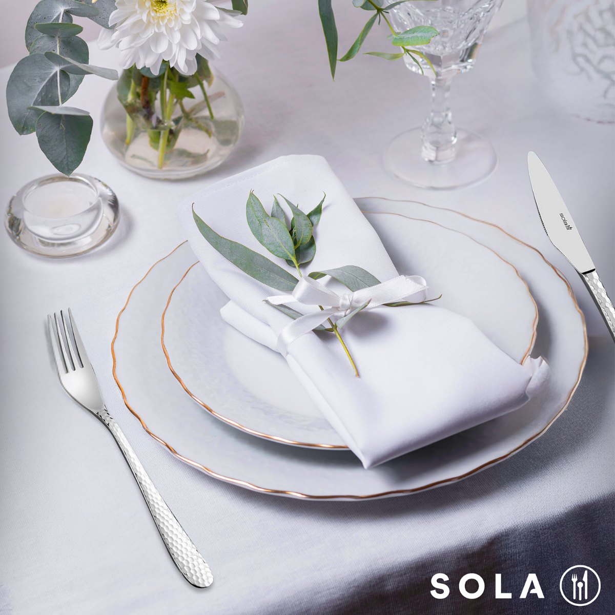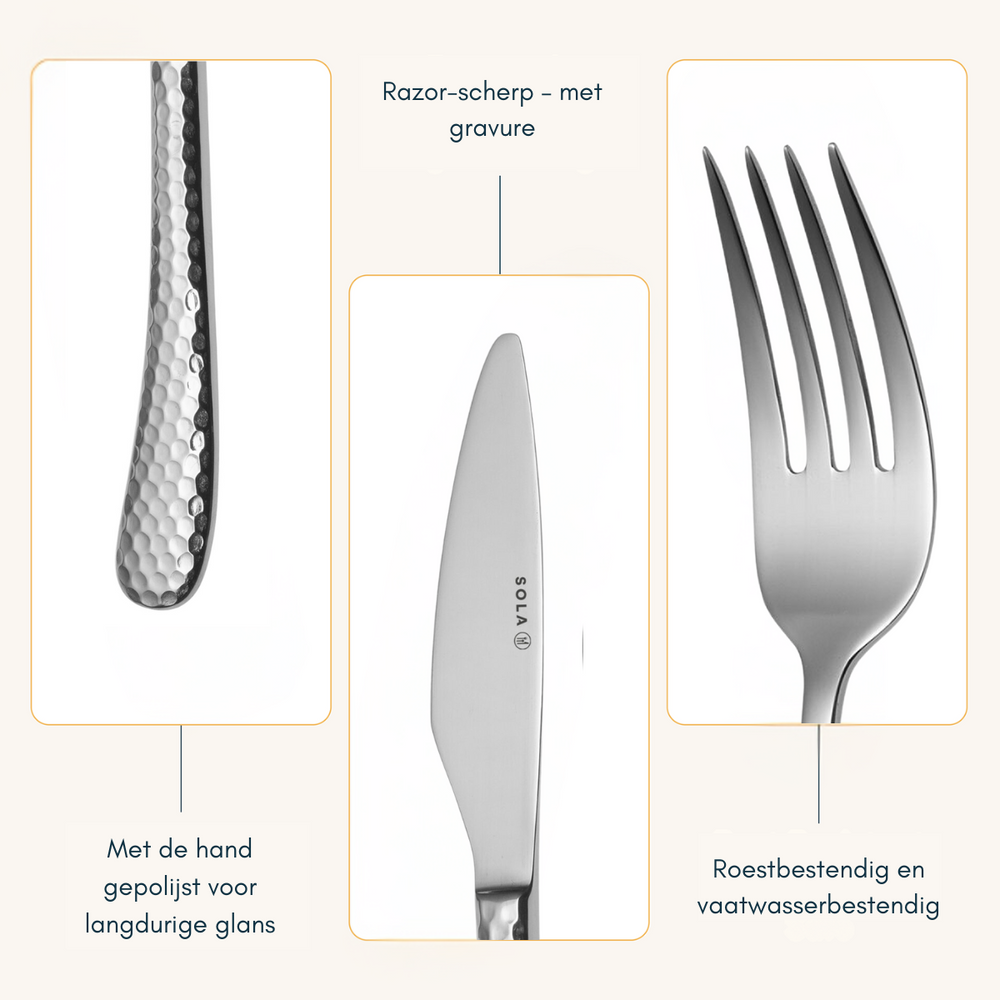 Sind Sie bereit für neues Besteck und legen Wert auf Qualität? Dieses Sola-Besteckset Lima ist ein 24-teiliges Set, bestehend aus den am häufigsten verwendeten Besteckteilen in der Küche. Das Sola-Besteck besteht aus silberweißem 18/10-Edelstahl. Silberweißer Edelstahl 18/10 ist eine Stahllegierung aus 18 Teilen Chromstahl und 10 Teilen Nickel. Diese Zusammensetzung macht das Besteck rostfrei und spülmaschinenfest. Dieses Set besteht aus: