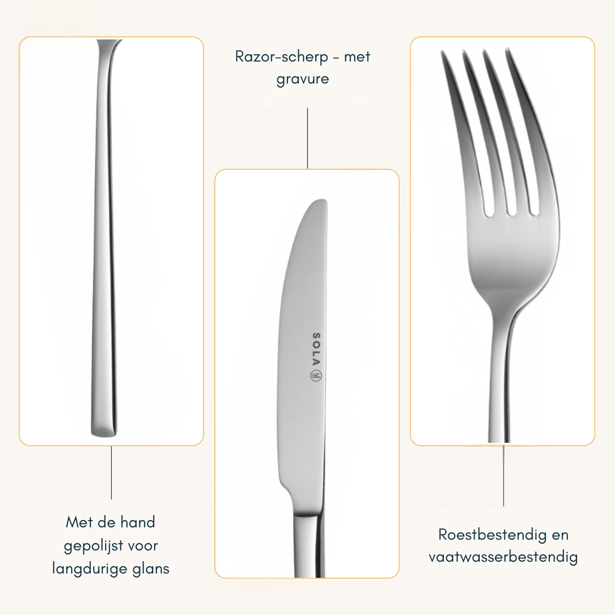 Die Sola Luxor Bestecklinie ist spülmaschinenfest, was die Pflege erleichtert und zusätzlichen Komfort bietet. Dieses Besteckset ist perfekt für alle, die einen modernen, klaren Stil in Kombination mit der Qualität und Tradition schätzen, für die Sola bekannt ist. Eine wunderschöne Ergänzung für jede Küche und Tischdekoration.
