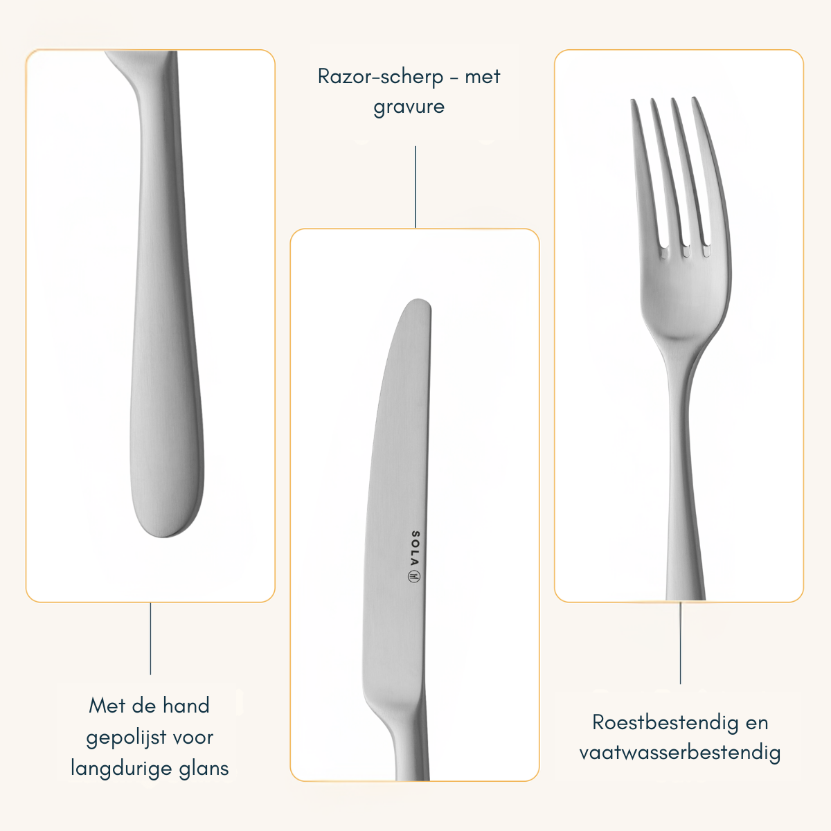 Die Sola Nordica Bestecklinie ist nicht nur stilvoll, sondern auch praktisch. Sie ist spülmaschinenfest, wodurch sie sich für den täglichen Gebrauch eignet. Mit ihrem zeitlosen und vielseitigen Design passt die Nordica Kollektion zu jedem Anlass, von einem informellen Abendessen bis zu einem festlichen Dinner. Eine ideale Wahl für alle, die modernes Design und hervorragende Qualität schätzen!