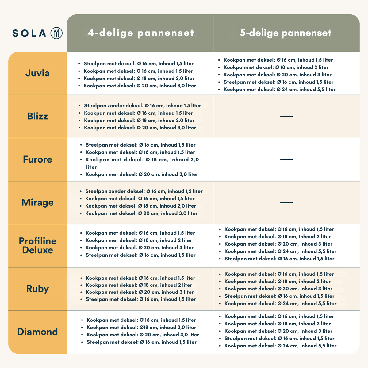 Profiline Deluxe gehört seit vielen Jahren zu den beliebtesten Sola Topfsets. Diese robusten und stabilen Töpfe verleihen deiner Küche sofort ein professionelles Aussehen. Möchtest du gerne noch einen zusätzlichen Topf aus der Profiline Deluxe Serie bestellen? Das ist möglich! Wir verkaufen nämlich auch Einzelteile aus dieser Serie.