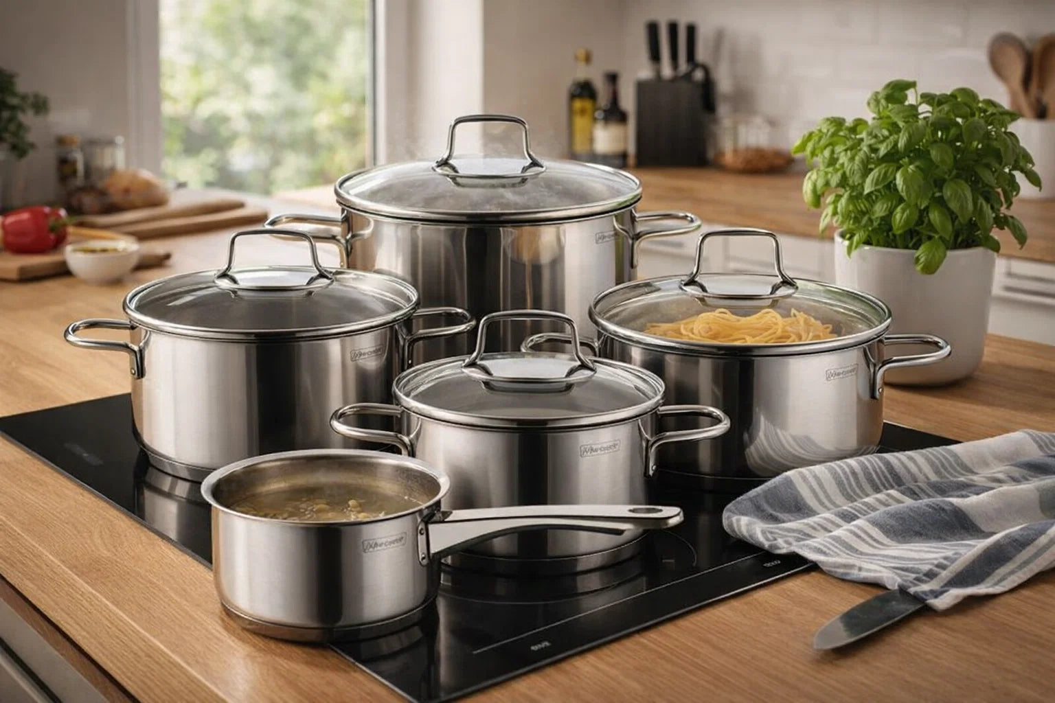 4× Kochtopf (Ø 16 cm, 20 cm, 24 cm und 28 cm) inklusive passender Glasdeckel